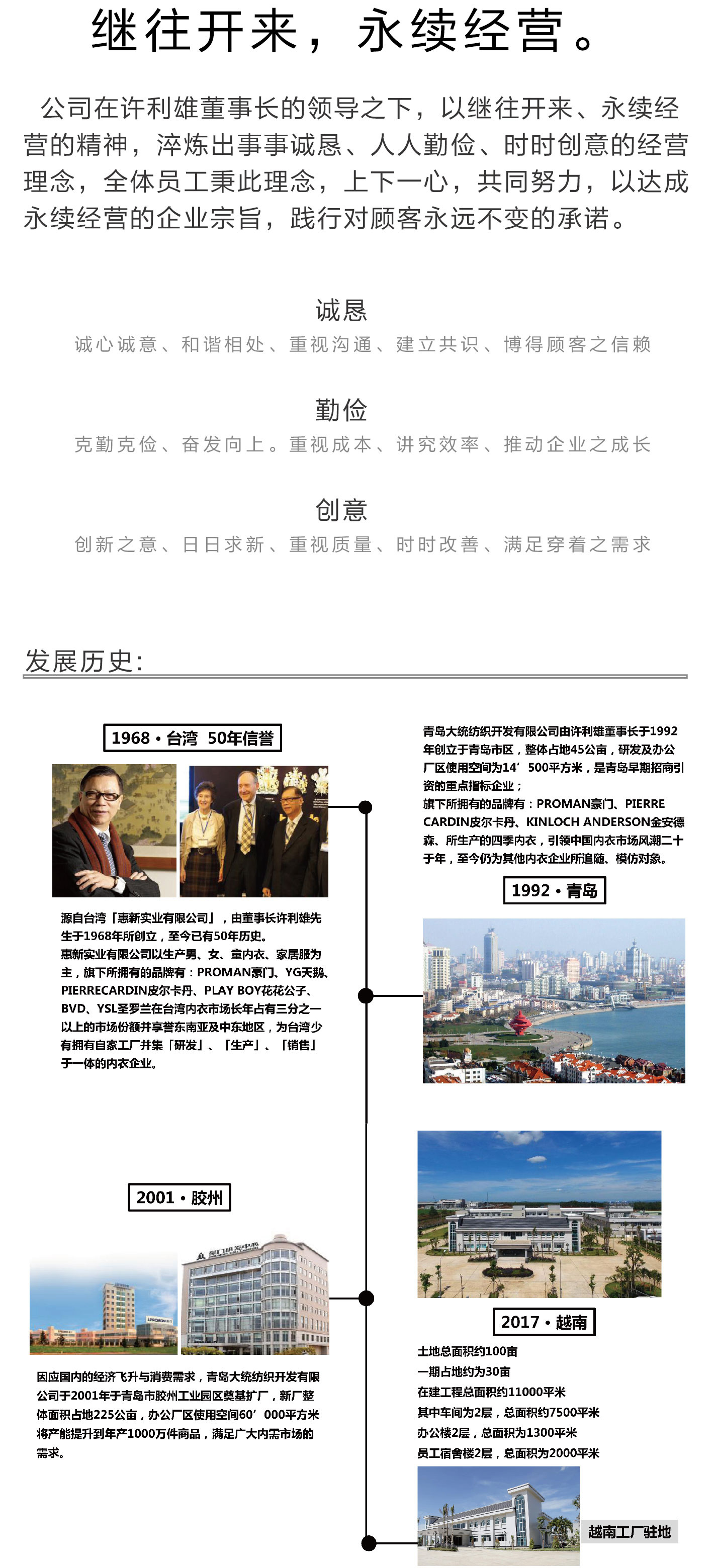 本公司在許利雄董事長領(lǐng)導(dǎo)之下,以繼往開來、永續(xù)經(jīng)營的精神,焠練出事事誠懇、人人勤儉、時時創(chuàng)意的經(jīng)營理念。